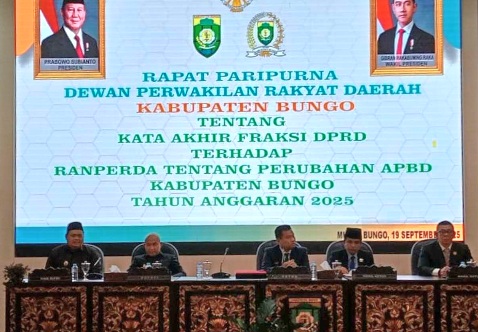 JAMBIBEDA.ID, Muara Bungo – DPRD Kabupaten Bungo menggelar rapat paripurna penyampaian kata akhir fraksi-fraksi terhadap Rancangan Peraturan Daerah (Ranperda) tentang Perubahan Anggaran Pendapatan dan Belanja Daerah (APBD) Tahun Anggaran 2025, Jumat (19/9/2025).