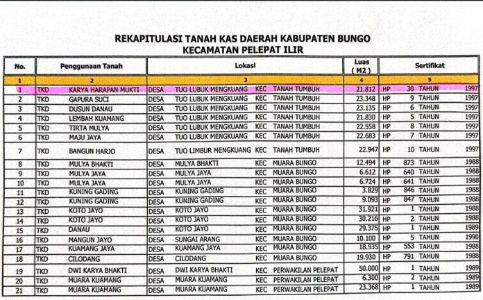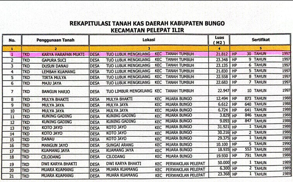 Dalam sidang tersebut, Syafrudin dari bagian aset Pemda Bungo selaku saksi yang dihadirkan oleh penggugat menyebutkan bahwa Tanah Kas Desa (TKD) milik Dusun Karya Harapan Mukti bertempat di Kecamatan Limbur Lubuk Mengkuang, bukan di Dusun Padang Palangeh, Pelepat Ilir, Bungo.