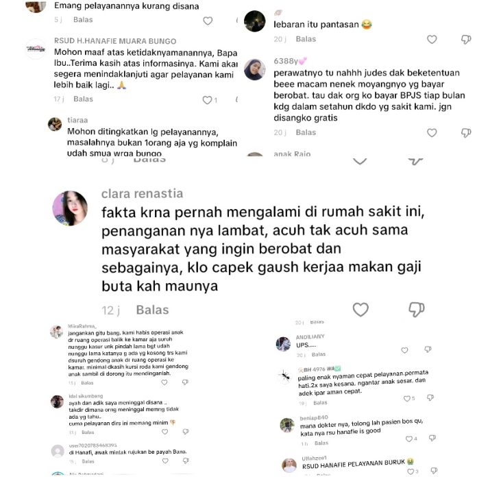 “Mohon maaf atas ketidaknyamanannya, Bapak/Ibu..Terima kasih atas informasinya. Kami akan segera menindaklanjuti agar pelayanan kami lebih baik lagi.. 🙏,” ucap pihak RSUD Bungo melalui akun Tiktok @RSUD H.HANAFIE MUARA BUNGO. (tim)
